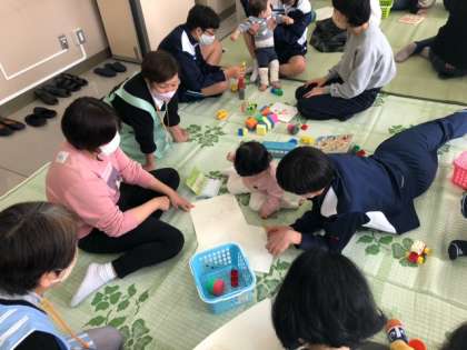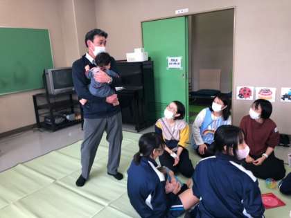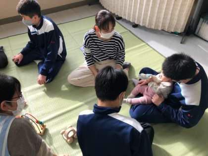 赤ちゃんも大きいお兄さんやお姉さん(中学生)に慣れてきました。あれ?やけに絵になっている生徒でない写真が混ざってますね。