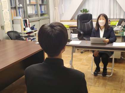 三年生は受験で実施される面接の練習に入りました。校長先生が面接官になり面接練習を行います。みんな緊張しつつしっかりとこたえています。
