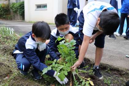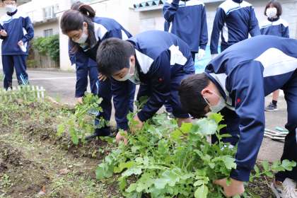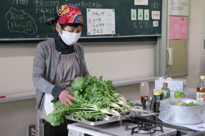 ときわ学級 栽培の様子2 公開日 2022/12/09 更新日 2022/12/09 ときわ学級 先週の授業で蕪や小松菜を収穫しなかった生徒達で、大根の収穫を行いました。 大きな葉っぱに小ぶりな大根ですが、とても美味しそうな大根に育ちました。 この大根は来週の調理に使用します。 今週の調理では、サラダに赤カブのスライスが入りました。 自分達で作った作物を食べるのは、命の学習となり、とてもためになります。 食べ物を大切にする心に繋がるといいなと思います。
