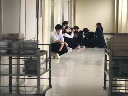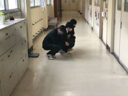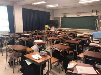 今日は地震を想定した避難訓練でした。教室にいる生徒たちはすぐさま机の下に身体を押し込み、廊下にいた生徒は廊下の中央に身をかがめます。みんな瞬時に行動していました。素晴らしい!