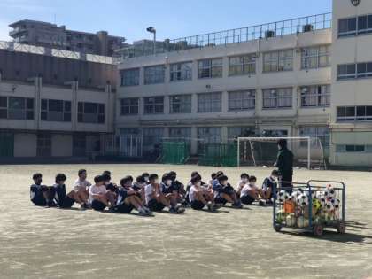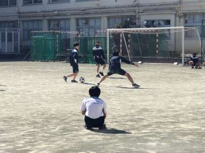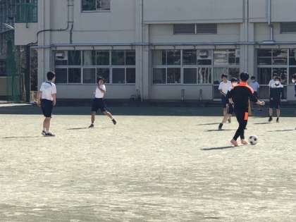 3年生が保健体育の授業でサッカーをやっています。あれあれ、ここにも3年生の担任の先生の姿が見えます。生徒たちと一緒に、楽しそうにボールを追っていました。