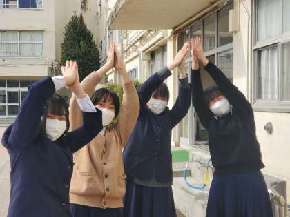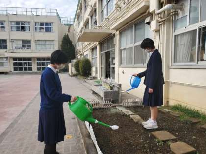 昼休みの職員室前の花壇です。いつものように水やりをしてくれています。スイセンは花をつけました。チューリップが早く育つように踊っています。