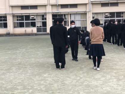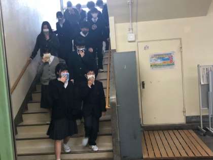 混み合う階段もルールを決めて生徒たちは整然と下りてきます。おしゃべりをすることなくみんな真剣に取り組んでいました。まさに「備えあれば憂いなし」ですね。