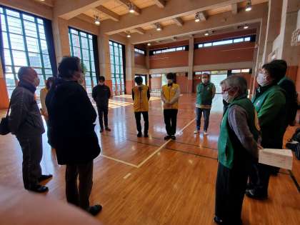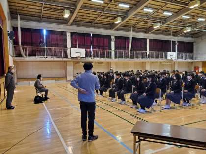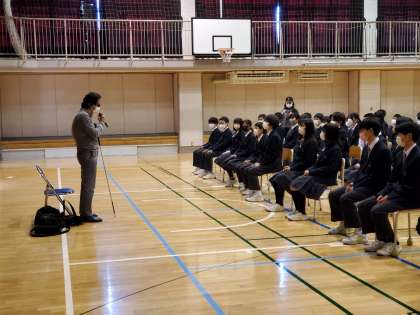 今日は一年生は午後福祉体験を行います。最初は白状体験を行います、講師の方からお話をいただいています。