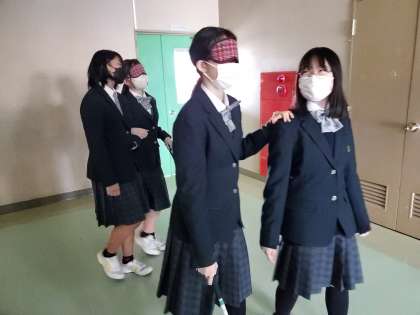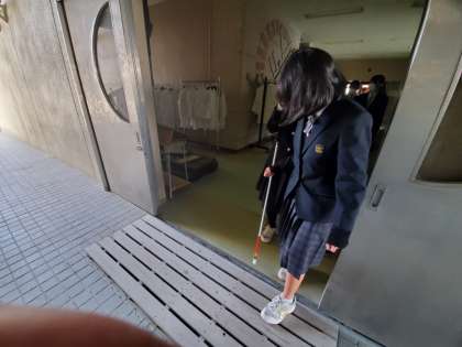 白杖体験 公開日 2023/02/17 更新日 2023/02/17 できごと 学年を分けて半分のメンバーがペアを組んで白杖体験をしました。見ているときには全く気にしていなかった小さな段差が、とてつもなく大きな壁に感じていました。