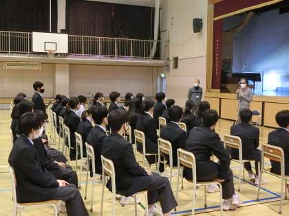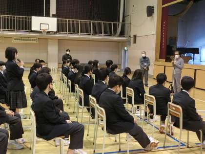 福祉体験(1年生)その2 公開日 2023/02/17 更新日 2023/02/17 できごと 大竹理事長より、視覚者障がい者への配慮、白杖の使い方などについて話を聞いています。 「困っている人がいたら、勇気を出して声をかけてほしい」という話がありました。