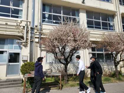 今日は三年生の開放日です。梅の花が少しずつ散っていきます。先生と梅を見たり、校庭で遊んでいます。