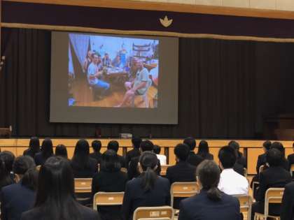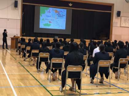 今日から、3年生は卒業に向けての特別時間割です。今日の1.2時間めは、JICA職員としてパプアニューギニアの現地の病院で理学療法士として働いた経験のある方を講師にお招きし、お話を伺いました。