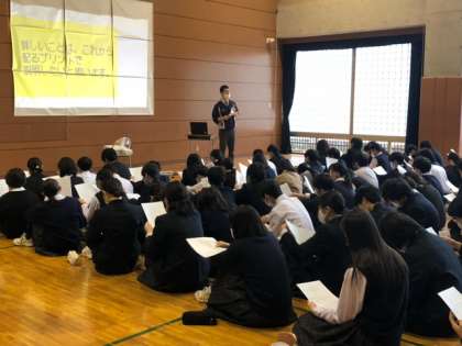 キャリア教育の一環として、来年度に実施予定の職場体験に向けて、学年ガイダンスが行われました。職場体験の目的や、実際に現2年生の実習時の様子、体験先の決定の進め方などを伝えました。生徒たちは熱心に話を聞いていました。
