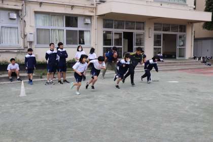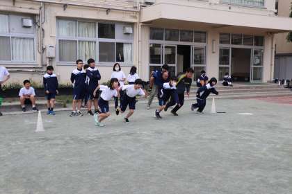 短距離走です。腕を振って〜、ももを上げて〜、よ〜いスタート!