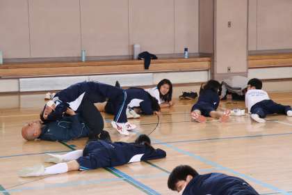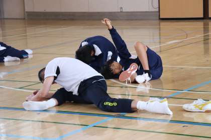 今日の体育は体育館で行っています。授業の最初にストレッチングをすることで、ケガの防止につとめています。なんか、とても楽しそう。
