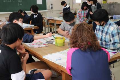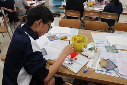 色紙作りモダンテクニックの授業です。たらしこみ、パチック、スパッタリングなどの技法を駆使して、自由な発想で色紙を作っています。