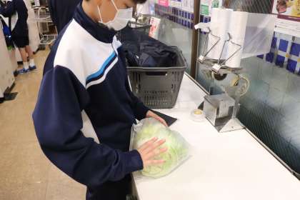 明日は『ハッシュドポーク・サラダ』のメニュー。食材を選び、セルフレジで支払い、これから学校に戻って、お釣りの計算をします。