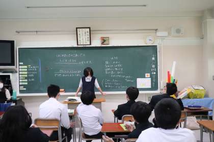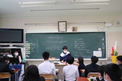 歌詞に名前や好きなもの・好きなことをあてはめて、自己紹介をしています。前に出て全員が歌って自己紹介をしました。