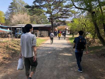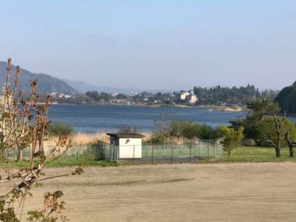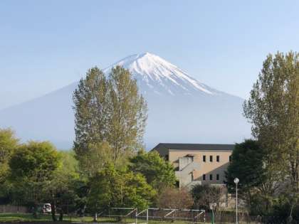 1年生が10月に実施する河口湖移動教室の実地踏査に来ています。富士山はまだ頭に白い雪をかぶっています。
