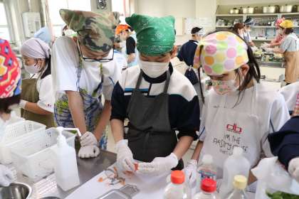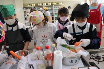 調理実習1 公開日 2023/04/21 更新日 2023/04/21 ときわ学級 今年度2回目の調理実習。1年生も授業の最初から参加しました。講師の先生の周りに集まって、サラダの下ごしらえを教えてもらいました。にんじんの皮をピーラーでむいています。
