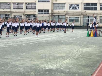 初めての運動会の全校練習。行進をする、ラジオ体操をする、入退場の時に全力で走る、一人一人がキビキビと動いていました。