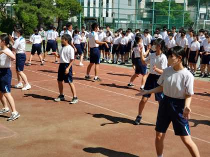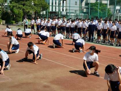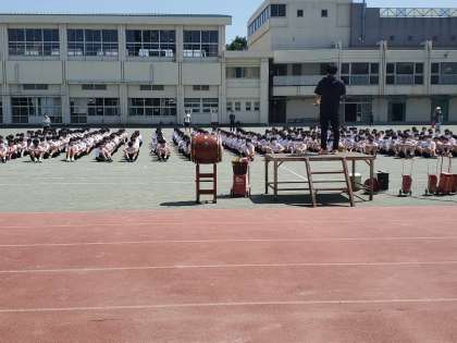 晴天の中の応援練習です。各色団ごとに練習しています。