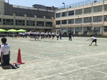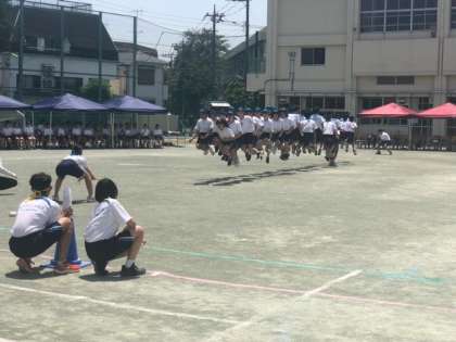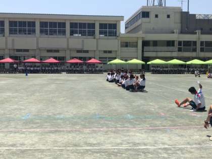 ?2年生大縄跳び、今日は赤組が72回跳び、トップでした。1回目と2回目の間の休憩時には、同じ色の他学年から応援の声が響きます。