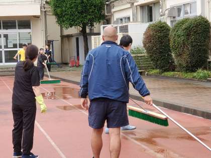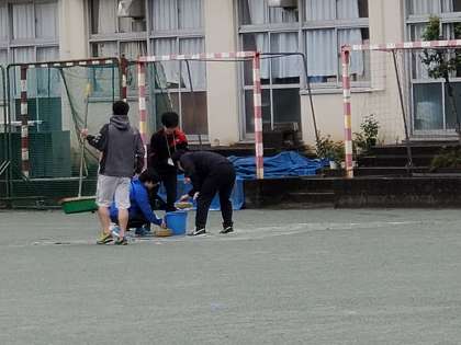 おはようございます。本日の運動会実施のために、校庭の水を取っています。先生たち総出でやっています。