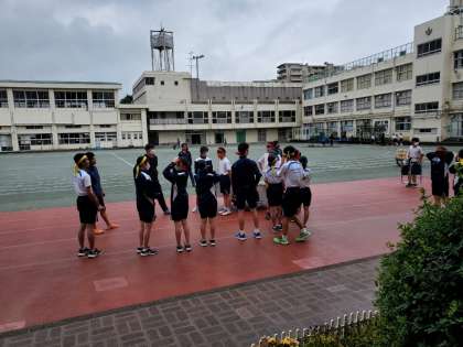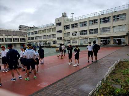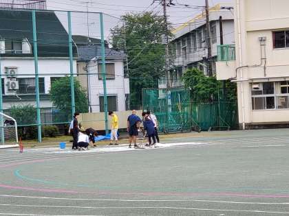 係生徒が登校して会場準備が進んでいます。校庭整備もあと少しです。