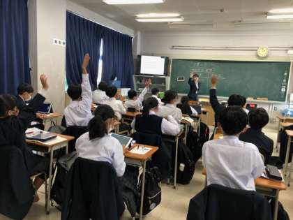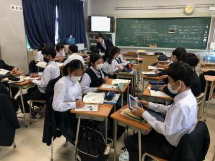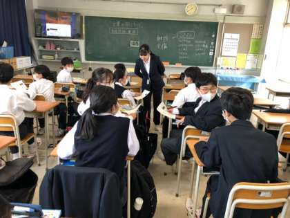 1年B組の道徳の授業は、教育実習生が担当しました。「言葉の向こうに」という題材を使って、SNSを介した言葉のやり取りや、相互理解について考えを深めました。活発に自分の考えていることを発言したり、班で考えを共有しあっていました。