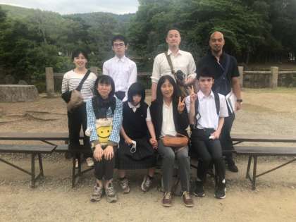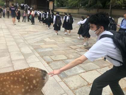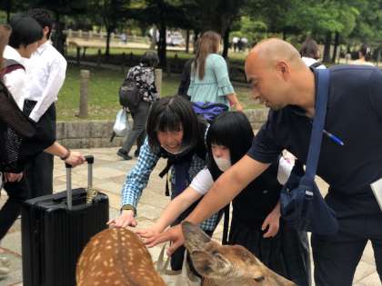 奈良公園に着きました。鹿を前に記念写真です。おっかなびっくり鹿にタッチ!