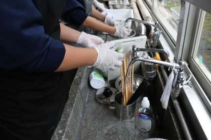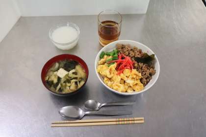 調理と洗い物は同時進行が鉄則。料理上手は片付け上手なんだって。あれ?三食丼じゃなくて五色丼になってるな〜。ごはんを炊く時に入れた昆布を刻んで載せたのと、紅ショウガも盛り付けたからだね。