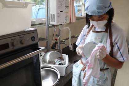 油がついた洗い物が多いので、今日は大変です。油が残らないようにゴシゴシ洗って、丁寧にふいています。