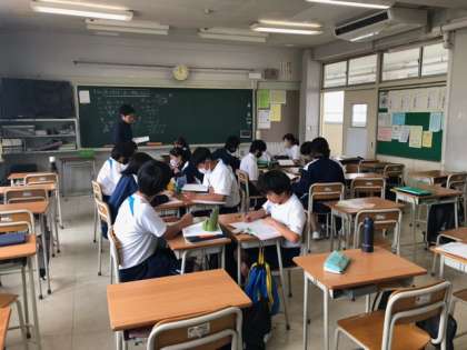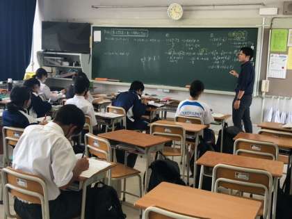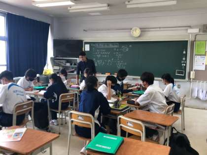 1年の数学の授業では「文字と式」のまとめの章末問題を進めていました。2.3人のグループて互いに学び合う時間をとるなどしながら、一つ一つ丁寧に確認していきました。みんな真剣に授業に参加していました!