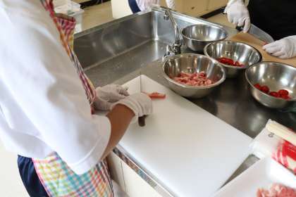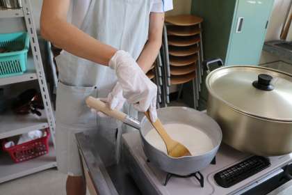 パンナコッタの材料は少し中火にかけます。ミニトマトときゅうりと豚肉を切ります。