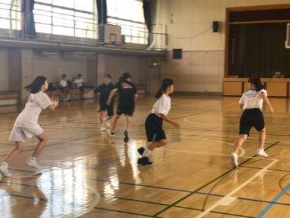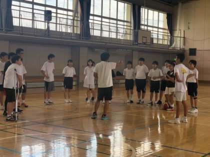 部活動頑張っています!(バスケ部) 公開日 2023/07/21 更新日 2023/07/21 できごと タップから速攻へ。お互いに教え合いをしながら練習を進めています。みんな一生懸命ボールを追っています。