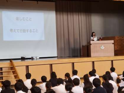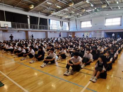 夏休みの生徒の活動の紹介から始まりました。2学期はどのように過ごすか。楽しむことと自分で考えて行動することのお話がありました。