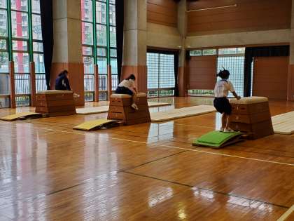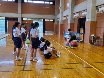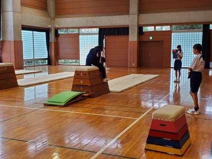 一年生の体育です。今日は跳び箱の跳びかたの練習です。最初に先生から基本的動作を教えてもらいました。まずは跳び箱に乗る形の練習です。タブレットで撮影をしてそれぞれの形を見合っています。
