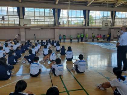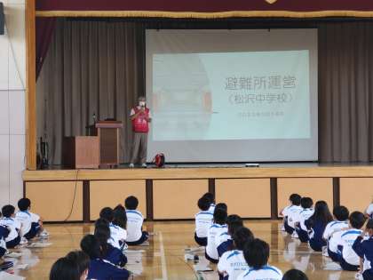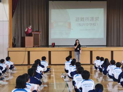 午後、一年生は学校避難所体験をしています。避難所運営委員長からお話を聞いています。