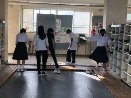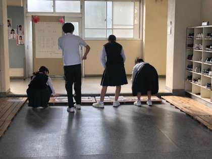 避難訓練は上履きで校庭に出るため、いつもこうして美化委員が昇降口で上履きの下を拭く雑巾を用意してくれています。ありがとう!