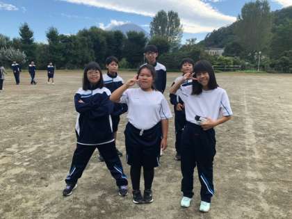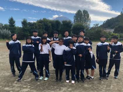 遠くに富士山を臨んで記念撮影です。全体写真と1年生。