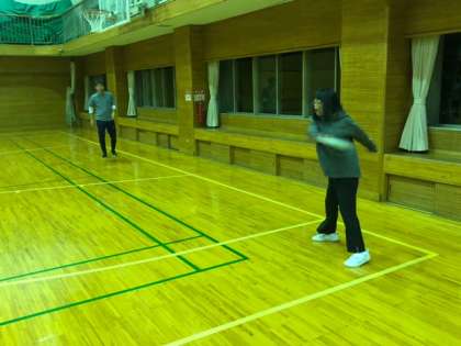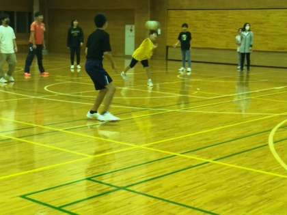 体育館でレクリェーション。鬼ごっこをしたり、フリスビーをしたり、ドッチボールをしたりしています!