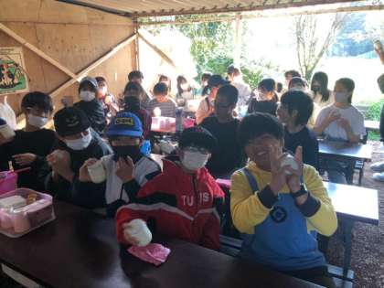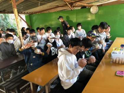 さあ、今度はバター作り体験です。みんな音楽に合わせて必死にシェイク!