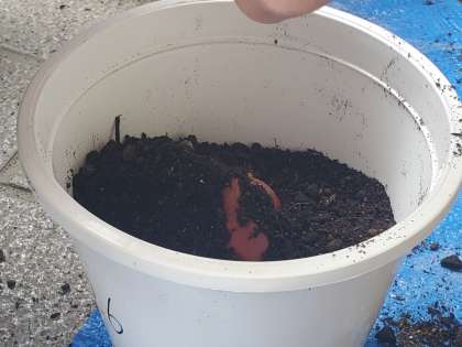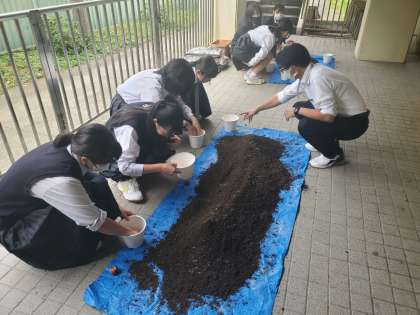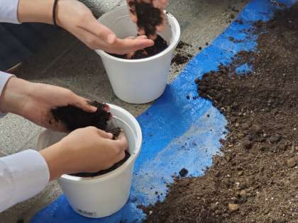 2年の技術におじゃましています。今日は栽培の授業です。チューリップの球根を植えています。早く芽を出せ〜