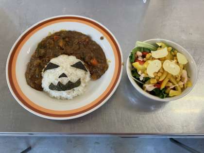 かぼちゃのドライカレー、ハロウィンサラダ、スイートパンプキンです!