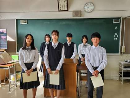 各委員長の任命式 公開日 2023/11/06 更新日 2023/11/06 できごと おはようございます。今朝の生徒朝会は後期の委員長の任命式です。皆さんよろしくお願いいたします。また明日からコンタクトレンズのケースとペットボトルキャップの回収です。
