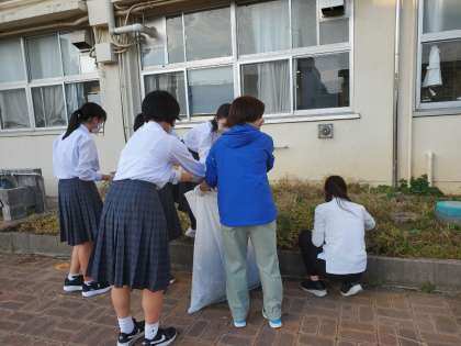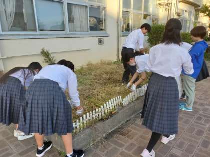夏休みにヒマワリが咲いていたところが草だらけになっていました。春の花に向けて生徒会役員が草むしりをしています。