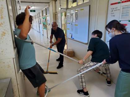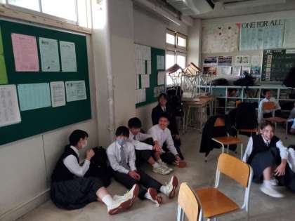 今月の避難訓練は不審者対応訓練です。放送が入った後、各授業教室でバリケードを組んで出入口をふさぎました。先生の不審者への対応も訓練しました。