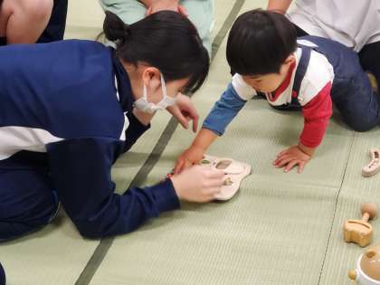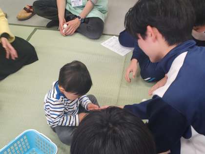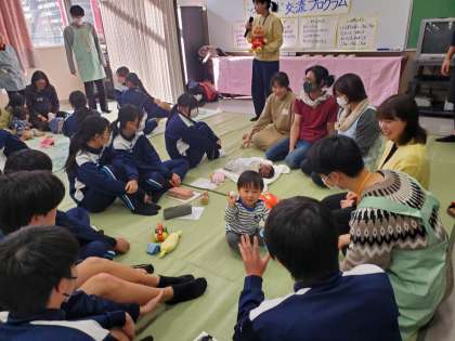 おはようございます。3年の家庭科の保育の授業で赤ちゃんふれあい体験を行っています。赤ちゃんとお母さんありがとうございます。とっても楽しい時間です。