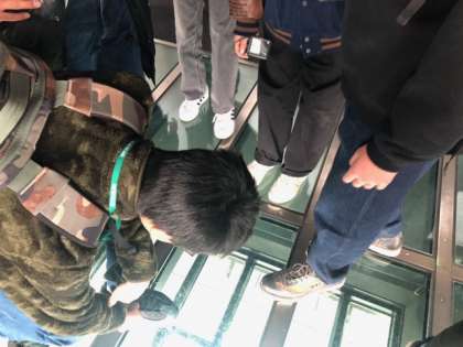 ?エレベーターや展望室の床の一部が透明ガラスになっていて、登っている様子やはるかな地上を見ることができます。ゾクゾクしますね。