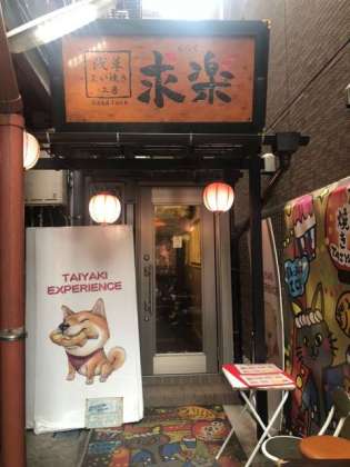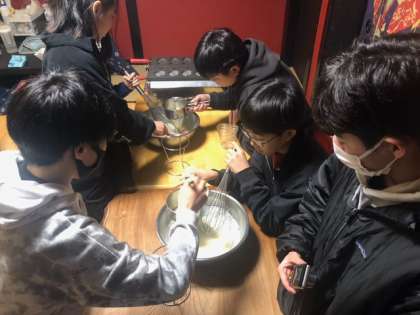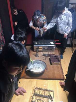 「求楽」というたい焼き屋さんで、二班がたい焼き作りにチャレンジしています。まずは、粉を水で溶いて、たい焼きの型に入れていきます。