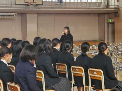 在校生 卒業式合唱練習 公開日 2024/03/06 更新日 2024/03/06 できごと こんにちは。再来週に行われる卒業式の在校生の練習です。最初に学年主任の先生から心構えについてと礼法練習、続いて音楽の先生から式歌と校歌の練習がありました。