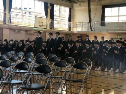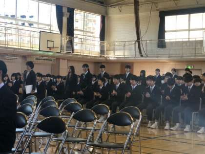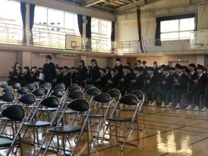 5年ぶりに全学年揃っての卒業式予行です。3年生入場です。みんな緊張の面持ちです。