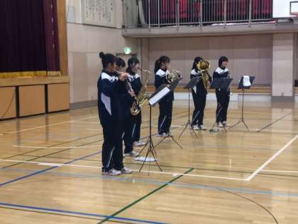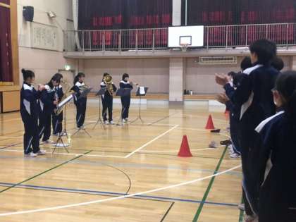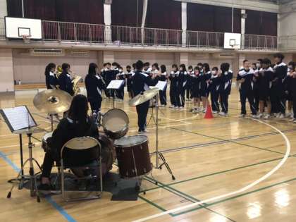 いよいよ演芸大会の始まりです。トップバッターは吹奏楽部の演奏です。曲に合わせてみんなノリノリです。あれ!?ドラムを叩いているのは誰でしょう!?